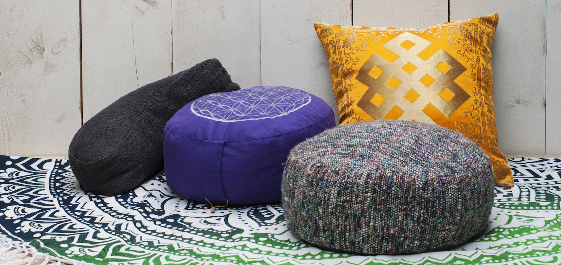 Een uitgebreid aanbod aan meditatiekussens. Effen kussens, met opdruk of met opvallende stof, zoals jeans.